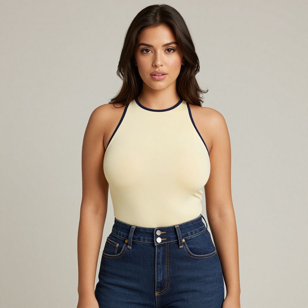"Woman, casual chic, sleeveless halter top in creamy yellow with navy blue trim, high neckline, form-fitting, paired with high-waisted navy blue jeans, front patch pockets, button closure, photo studio background with a light neutral color.. Sexy. Pretty face and beаutiful eyes. Big breasts."