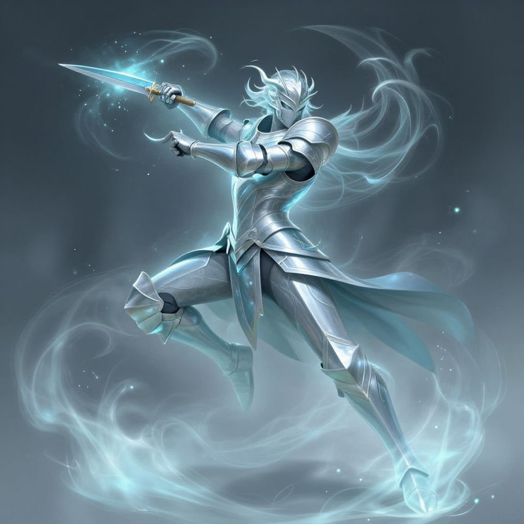 Digital artwork of a silver-armored, ethereal warrior with flowing blue mist, wielding a glowing blue sword, surrounded by swirling blue energy.