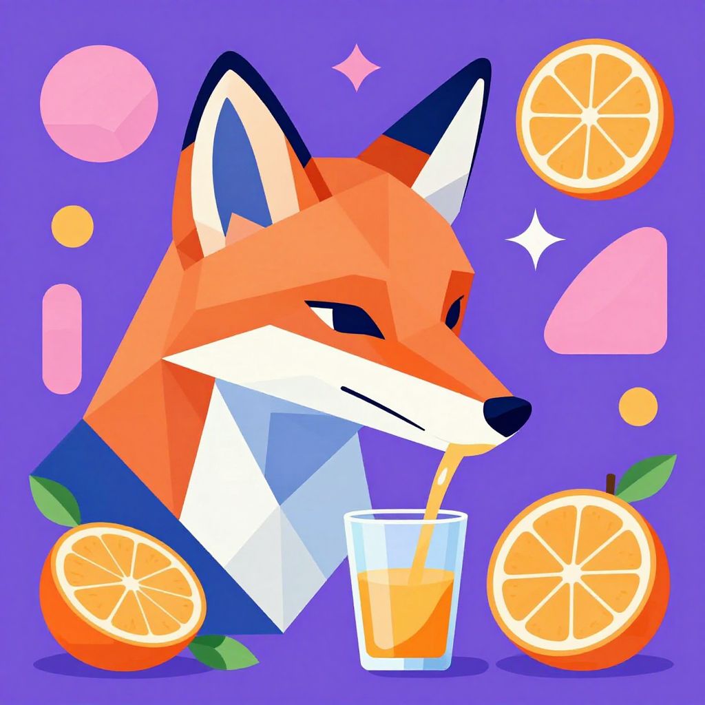 Colorful geometric illustration of a fox head with vibrant blue, orange, and pink polygonal shapes. The fox appears to be pouring orange juice into a glass, surrounded by stylized citrus fruits and abstract shapes on a purple gradient background.