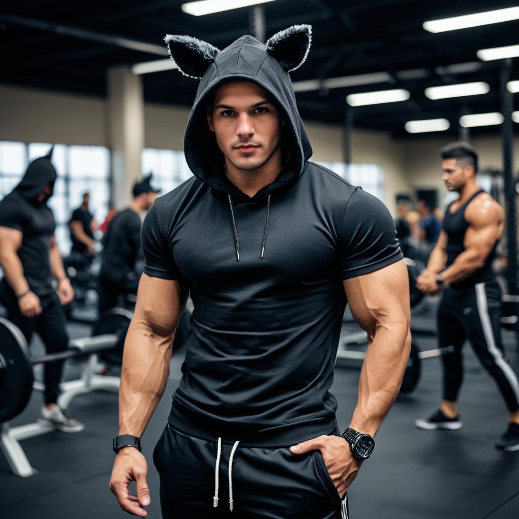 Halloween costume gym rats,male focus, 1boy, solo, hood, shirt, pants, watch, animal ears, wristwatch, fake animal ears, black pants, muscular, black hair, blurry background, animal hood, hood up, black shirt, short hair, muscular male, looking at viewer, closed mouth, blurry, realistic