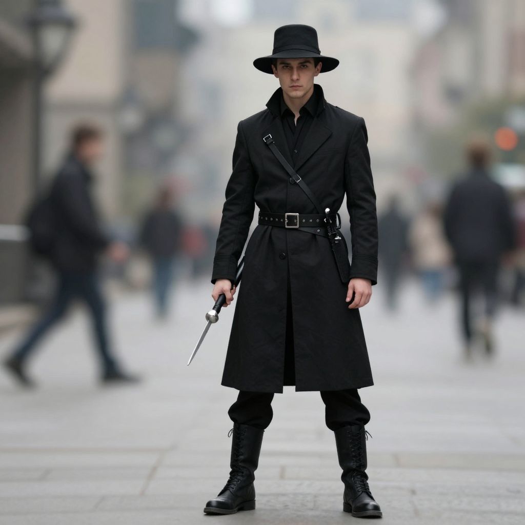 Photograph of a tall, slender man with light skin and dark hair, standing confidently on a blurred urban street. He wears a long, black, belted trench coat, black pants, and black boots with buckles. A black bowler hat sits on his head, and he holds a slim, silver dagger in his right hand. The background is out of focus, showing people walking and city buildings with a misty, overcast atmosphere. The man's serious expression and poised stance give a mysterious, almost noir-inspired vibe to the image.