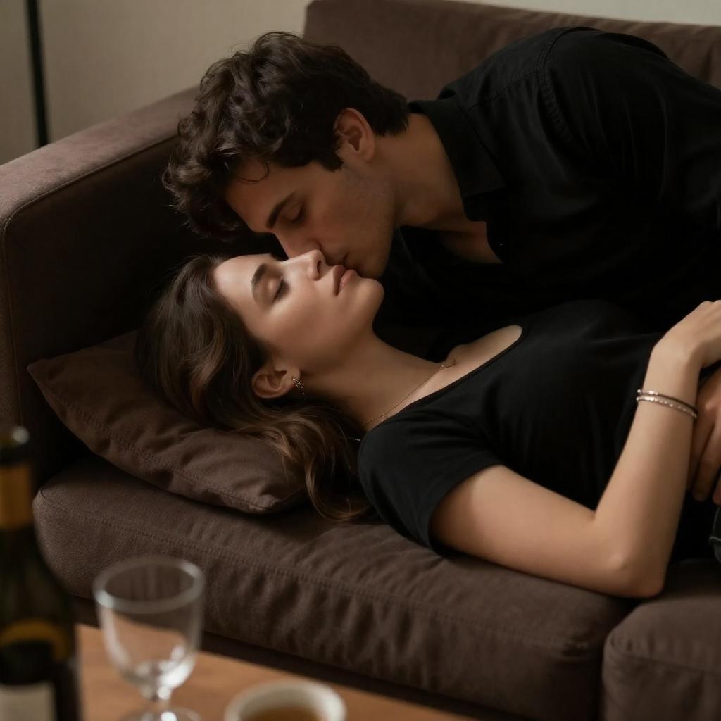Photograph of a couple lying on a brown couch. Man with dark hair, black shirt, kissing woman's forehead. Woman with light brown hair, closed eyes, black shirt, wearing bracelets. Glass and bottle on table in foreground. Low lighting. Intimate.