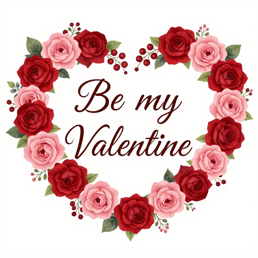 Romantic heart-shaped floral design featuring vibrant red and pink roses, green leaves, and small berries, encircling the phrase 'Be my Valentine' in elegant cursive script.