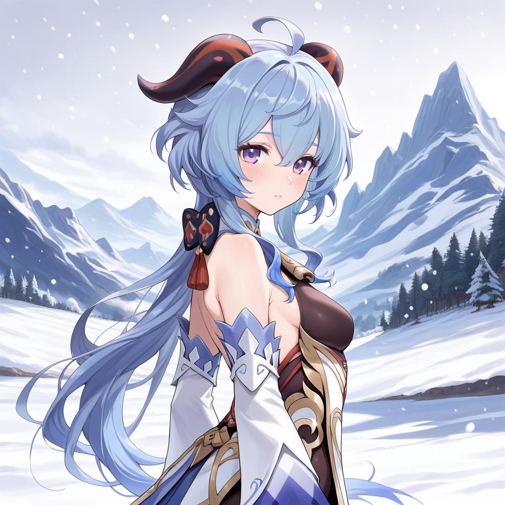 (masterpiece, best quality:1.2), 1girl, solo, standing, upper body, ganyu \(genshin impact\), blue hair, long hair, mullet, black horns, purple eyes, small breasts, white sleeves, looking at viewer, outdoors, mountains, snowing, mountain peek, pines