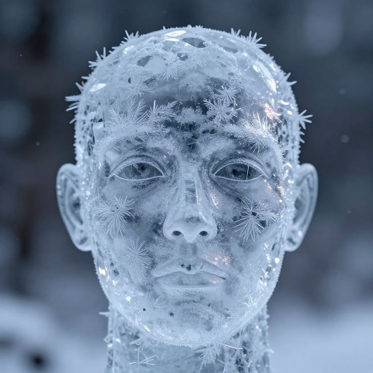 Photograph of a crystallized human face, covered in intricate ice crystals, with a blue monochromatic background, creating a frosty, ethereal