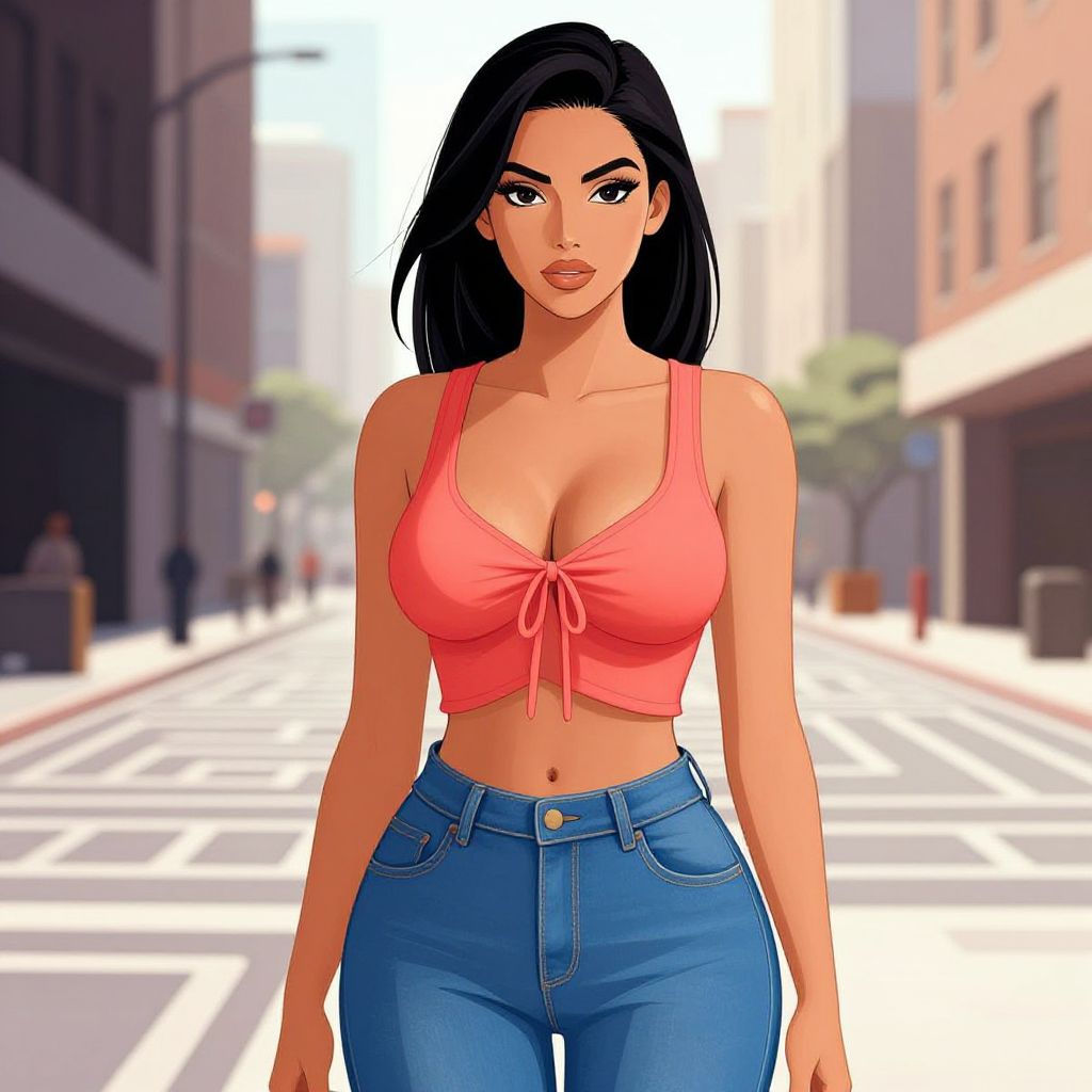 Digital illustration of a confident woman with long black hair, wearing a pink crop top and blue jeans, standing on a sunlit urban street.