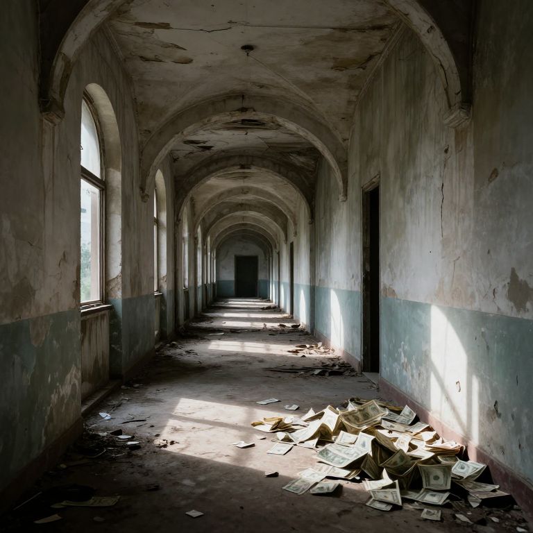 Abandoned corridor stretches endlessly, its arched ceilings and crumbling walls framing a surreal scene of scattered currency piles beneath a shaft of sunlight piercing through the decay.