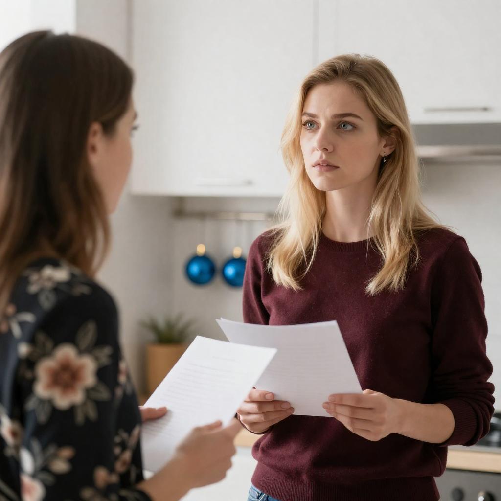 Photograph of a blonde woman with long hair, smiling, holding a black clipboard. She wears a striped shirt, sitting in a dimly lit room with red and yellow lighting. Background includes a standing person and various objects on shelves.