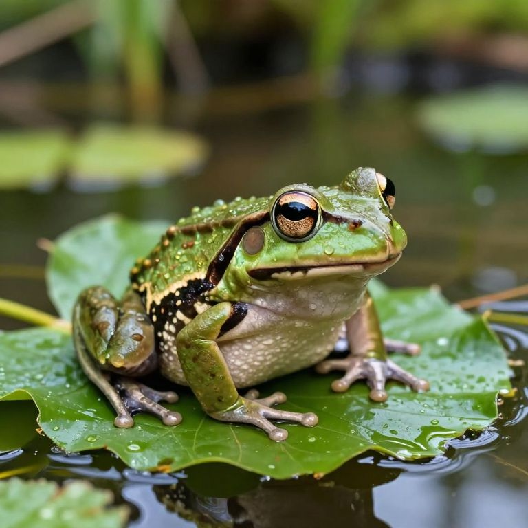 Photograph of a vibrant green frog with large, round, dark eyes and black stripes on its back, sitting on a glossy, wet, green lily pad in a shallow pond. The frog's skin has a slightly shiny texture, and tiny water droplets are visible on its body and the lily pad. The background is blurred, featuring more green lily pads and water, creating a natural, serene aquatic habitat. The image is sharply focused on the frog, highlighting its detailed features against the soft, out-of-focus background.