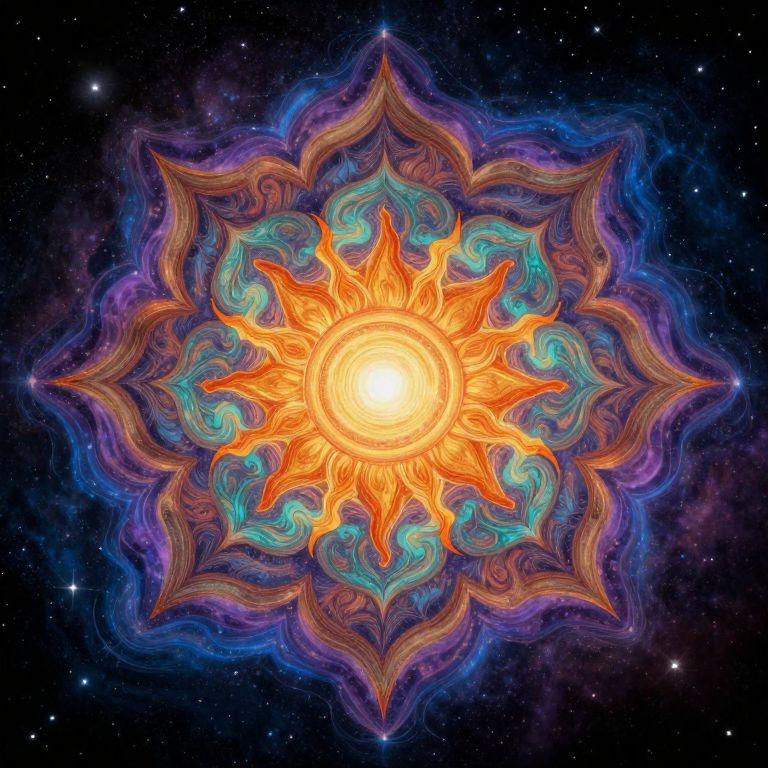 This digital artwork depicts a vibrant, radiant sun set against a star-filled, dark cosmic background. The sun is at the center, glowing intensely with a bright yellow-orange core surrounded by fiery, flame-like rays. Encircling the sun is a complex, symmetrical mandala-like pattern in swirling shades of blue, purple, and orange, creating a hypnotic, glowing effect. The pattern's edges are defined by intricate, wavy lines that blend into the starry, textured space. The overall composition combines elements of surrealism and cosmic art, evoking a sense of both warmth and the infinite expanse of outer space.