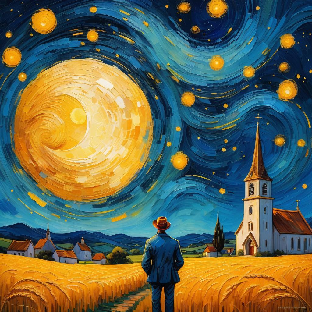 A thoughtful man with a reddish beard looking up at a swirling night sky filled with bright stars and a large glowing moon, standing in a golden wheat field with a small village and church steeple in the distance, post-impressionism style with expressive swirling brushstrokes and vibrant blue and yellow colors reminiscent of Van Gogh