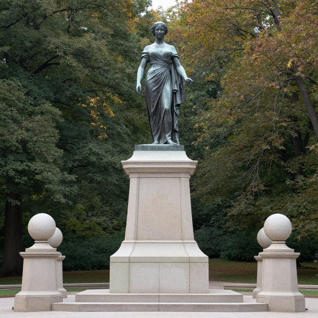 Monumental bronze statue of a historical woman stands atop a tiered stone pedestal in a serene park setting, flanked by two spherical finials and surrounded by lush green trees and autumn foliage.