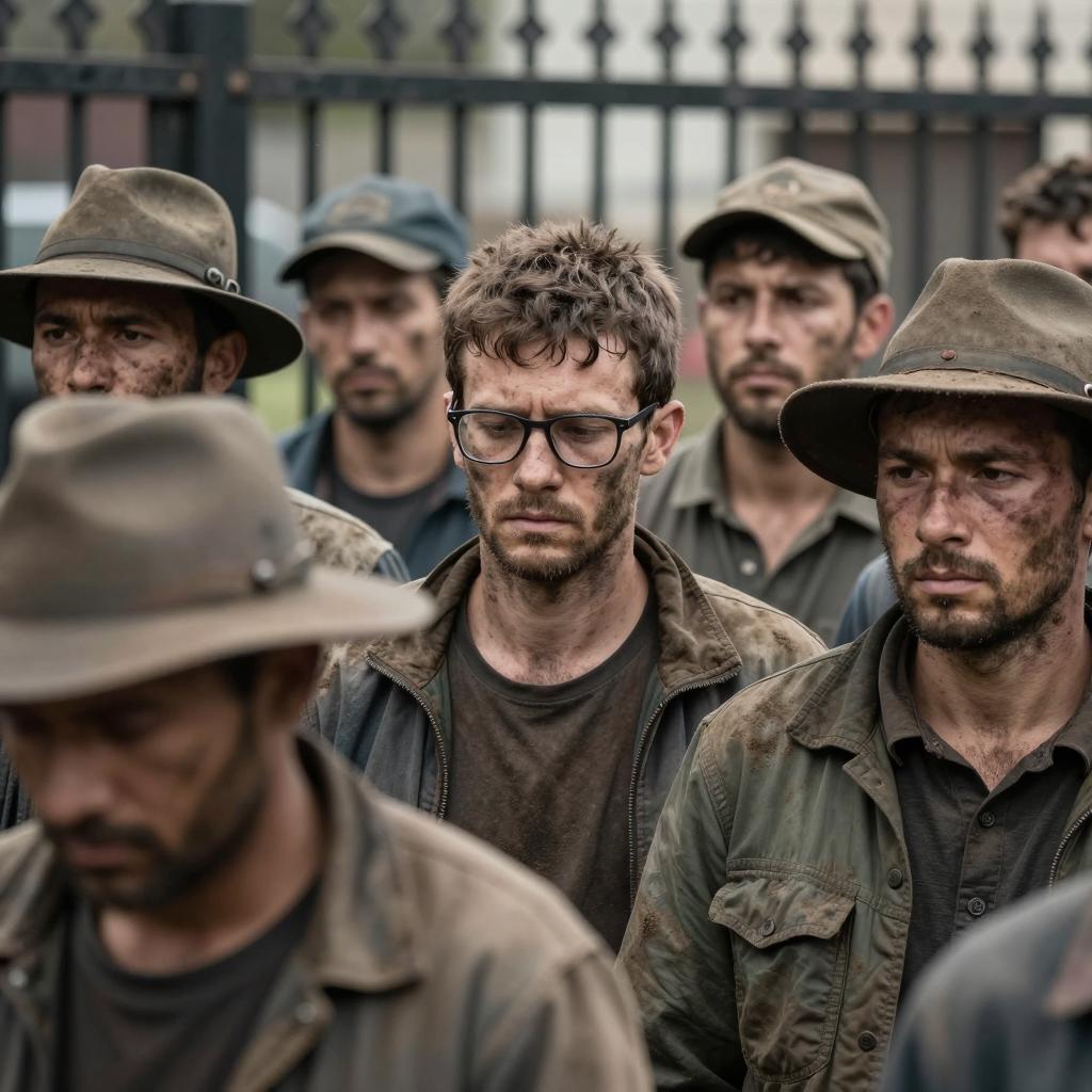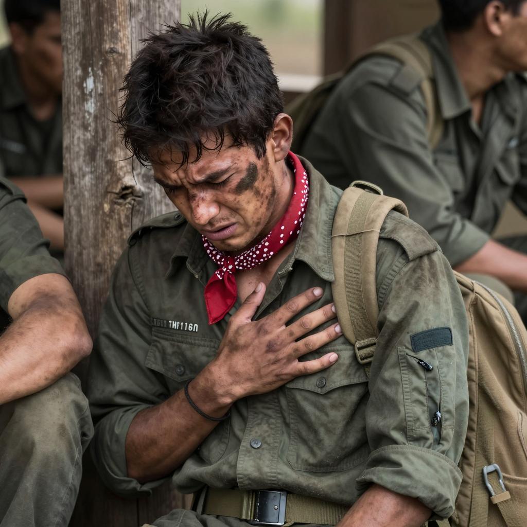 Male soldier with dirty, sweat-covered face and curly brown hair, wearing torn green military shirt, holding rifle. Dense, green jungle background with fallen logs and mist. Soldier's expression is grim. Two additional soldiers lying on ground in background. Military gear and foliage are prominent.