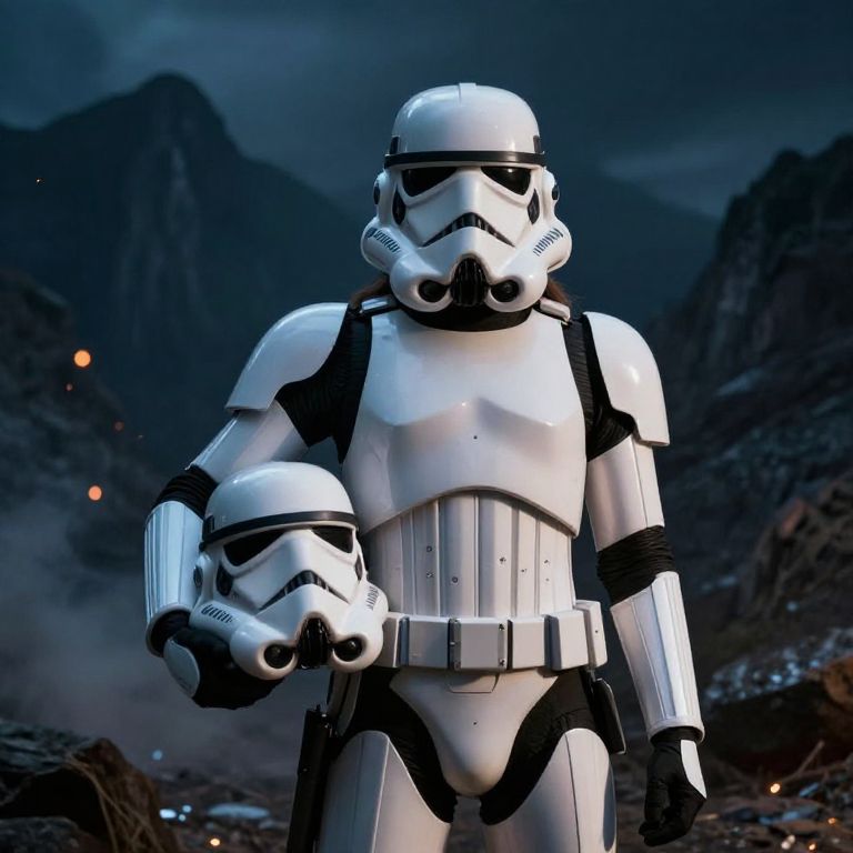 Ecstasy female in stormtrooper armor with helmet off, helmet in her hands, beautifull hair to the neck, in dark glowing mountains at night, smoldering particles in the air,