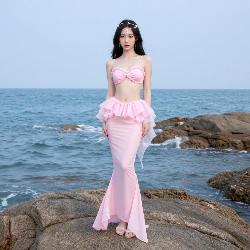 Pink Mermaid Costume, mermaid in a pink dress standing on rocks near the ocean