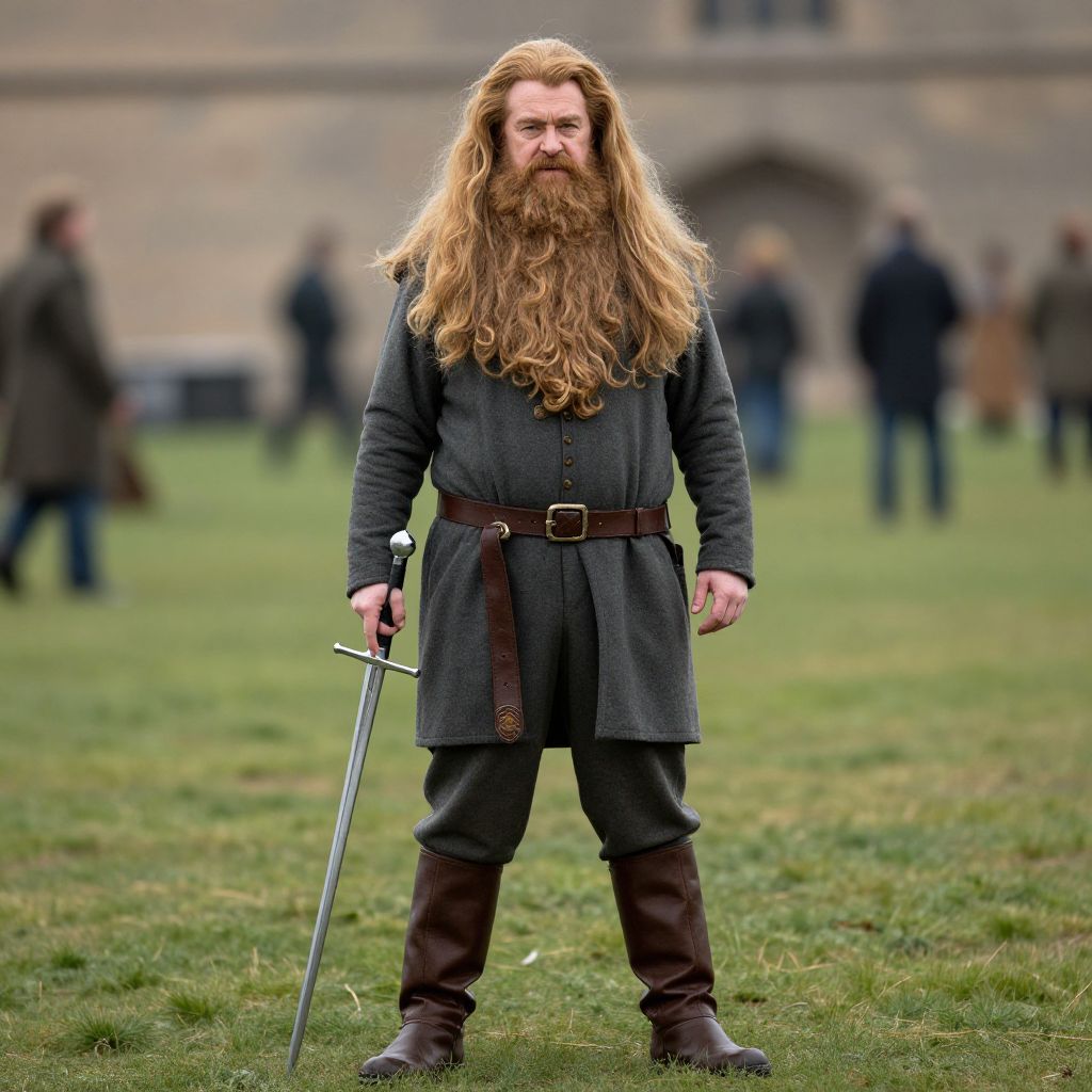 Photograph of a bearded man with long, wavy blonde hair, wearing a dark grey tunic, brown belt, and boots, holding a