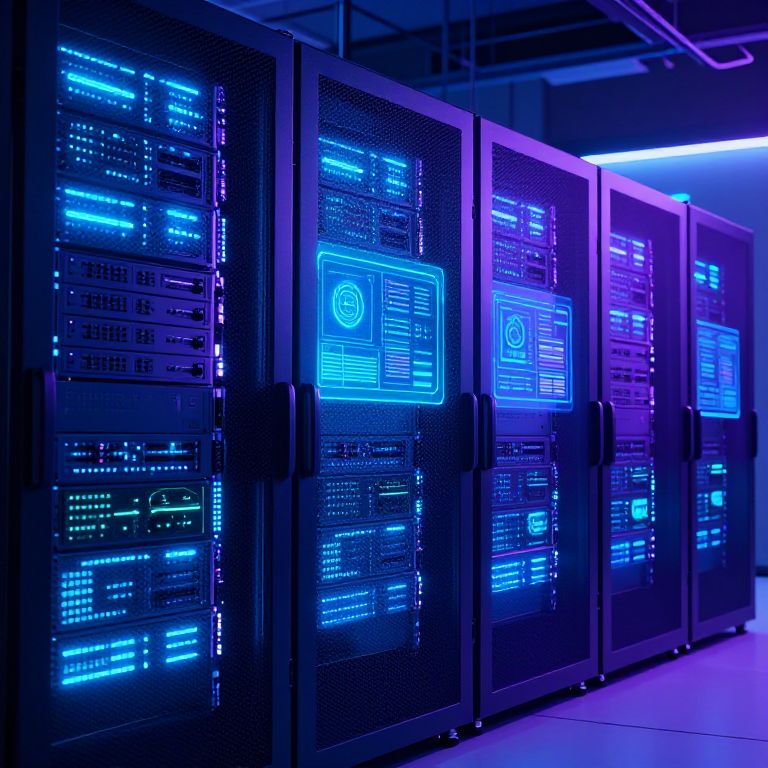 Photograph of illuminated blue and purple server racks with glowing digital interfaces and intricate circuitry in a dark, industrial room.
