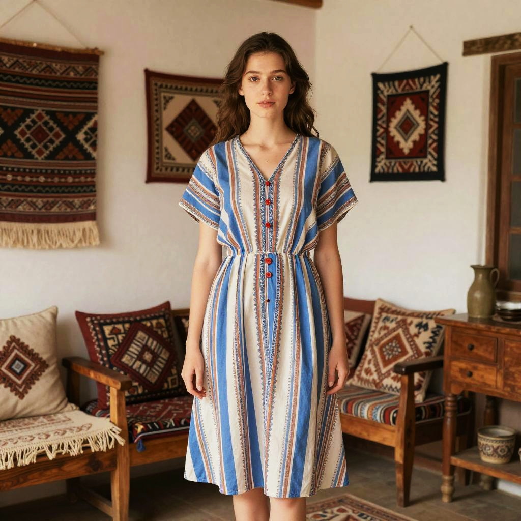 A young woman stands confidently in a cozy, traditionally decorated room, wearing a light-colored dress with bold blue and multicolored stripes. The interior reflects a warm, folk-inspired style with woven textiles, embroidered wall art, and wood furniture, creating a homely and inviting atmosphere.
