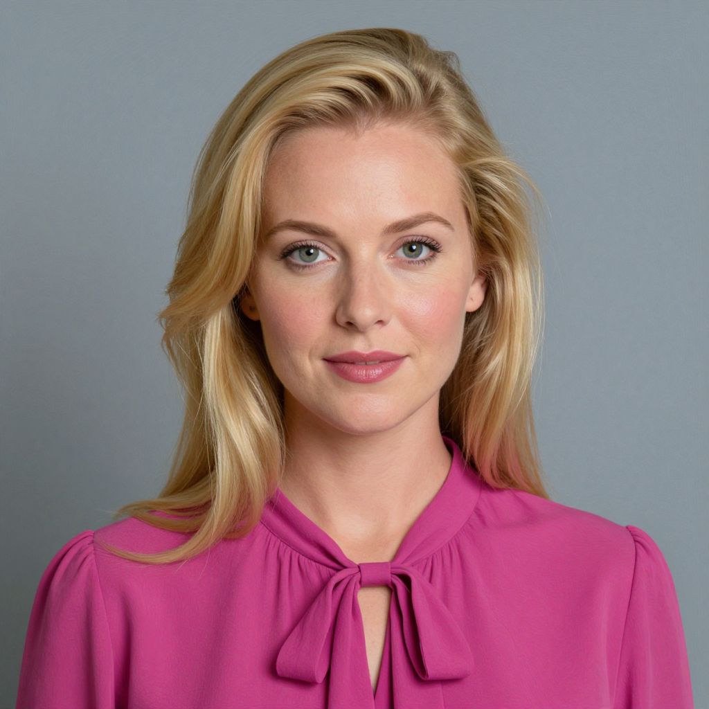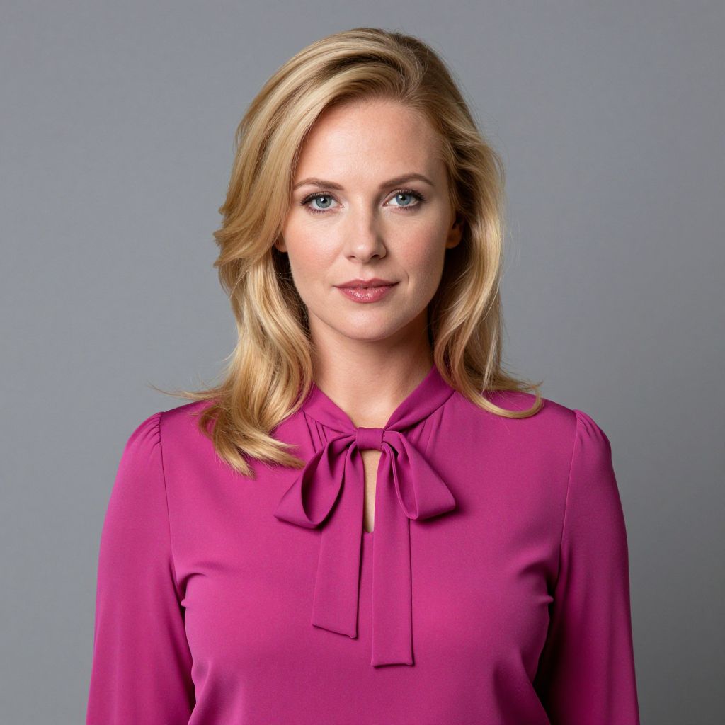 A painted portrait of a blond woman in a fuchsia pussy-bowed blouse.