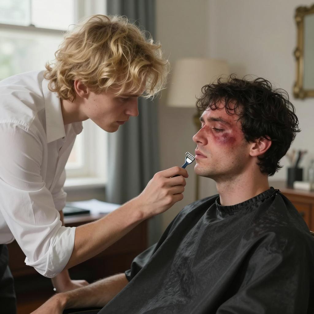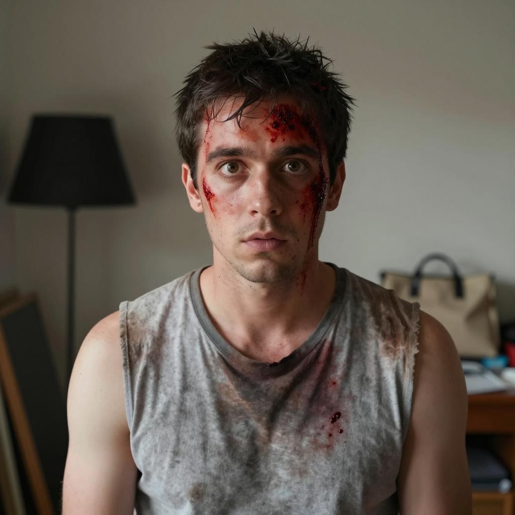 Shocked Man with Blood on Face Looking in Bathroom Mirror