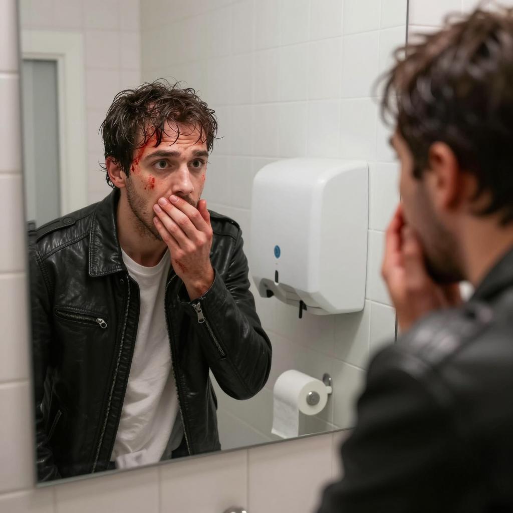 Man with dark, wet hair and blood on his face and hands covers his mouth in shock. He leans against a mirror in a tiled bathroom. Reflection shows same expression. White toilet paper dispenser in background. He wears a black leather jacket over a white shirt. Two people visible, both the man and his reflection.