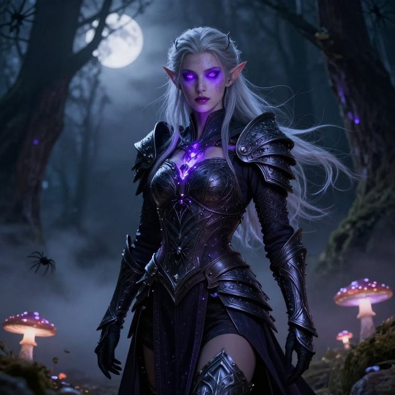 Beautiful drow warrior standing confidently in a moonlit forest, her silver hair flowing, eyes glowing with mystical purple light, intricate dark armor adorned with spider motifs, ethereal atmosphere with fog and glowing mushrooms, fantasy art style.