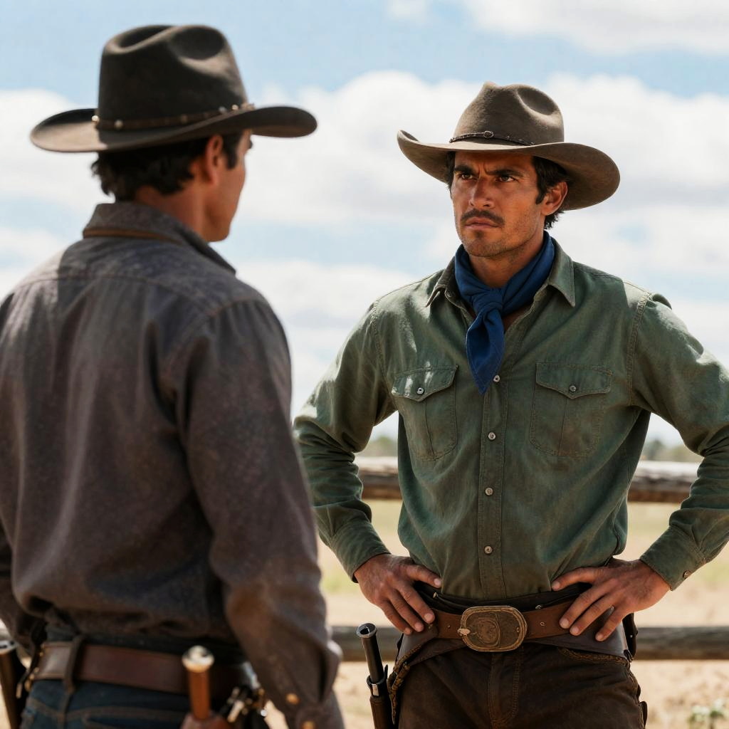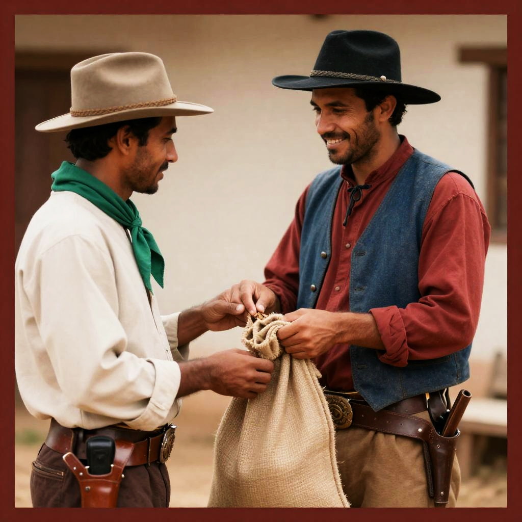 Two men in Western attire, one in a red shirt, blue vest, and black hat, holding a sack, the other in a light shirt, green scarf, and beige hat, holding a small object, indoors, exchanging items. Right man smiles. Right man wears holster. Poster style image.