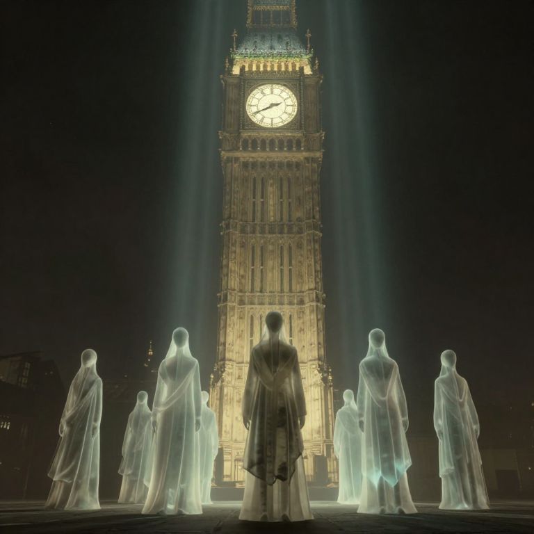 Photograph of a nighttime scene featuring a glowing, illuminated Big Ben clock tower in the background. In the foreground, ten translucent, white, ghostly figures, dressed in flowing robes, stand in a semi-circle with their backs to the camera. The figures have a mist-like appearance, with soft blue lighting highlighting their ethereal quality. The figures' robes and the ground they stand on are illuminated by beams of light, creating a dramatic, almost otherworldly atmosphere. The dark night sky contrasts with the bright lights, emphasizing the ghostly figures and the iconic clock tower.