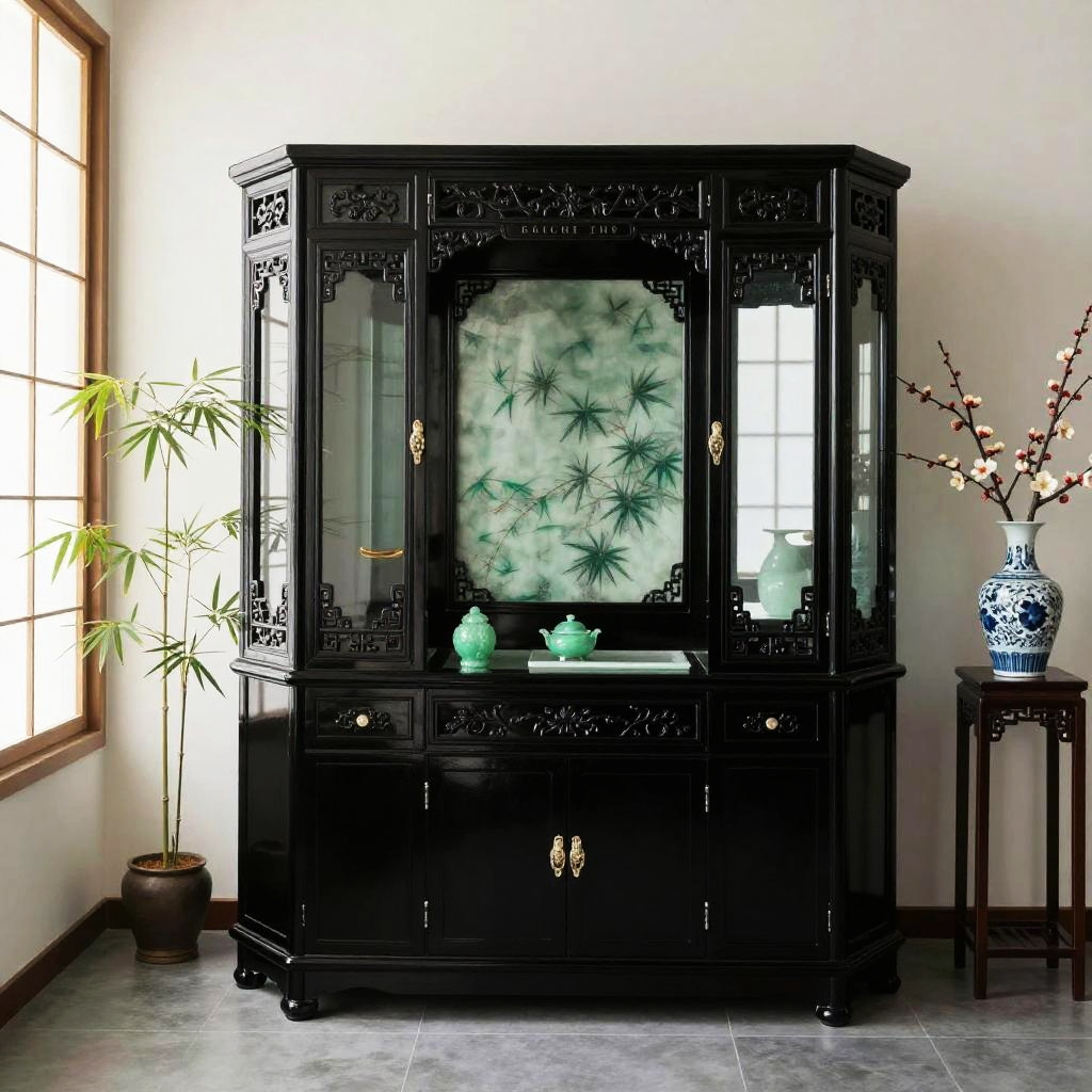 Chinese room design combining modern minimalism with ancient aesthetics: sleek black lacquer furniture, jade green accents, bamboo plants, soft natural lighting through rice paper windows, and decorative porcelain vases filled with plum blossoms