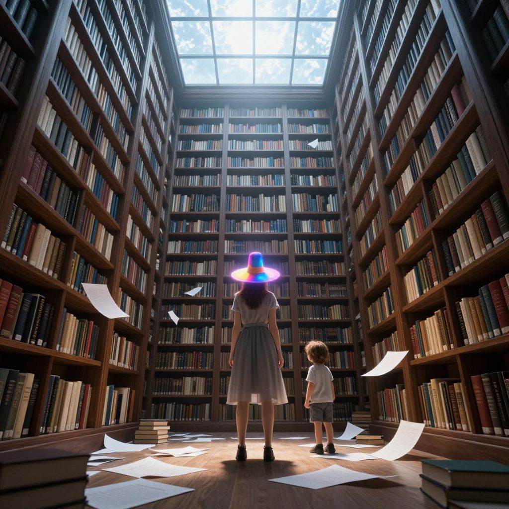 A surreal digital artwork depicts a towering library with endless shelves of books, illuminated by ethereal light filtering through a glass ceiling, as a woman wearing a kaleidoscopic hat and a child stand amidst scattered papers, evoking a sense of wonder and mystery in this cyberpunk-inspired, high-definition rendering.