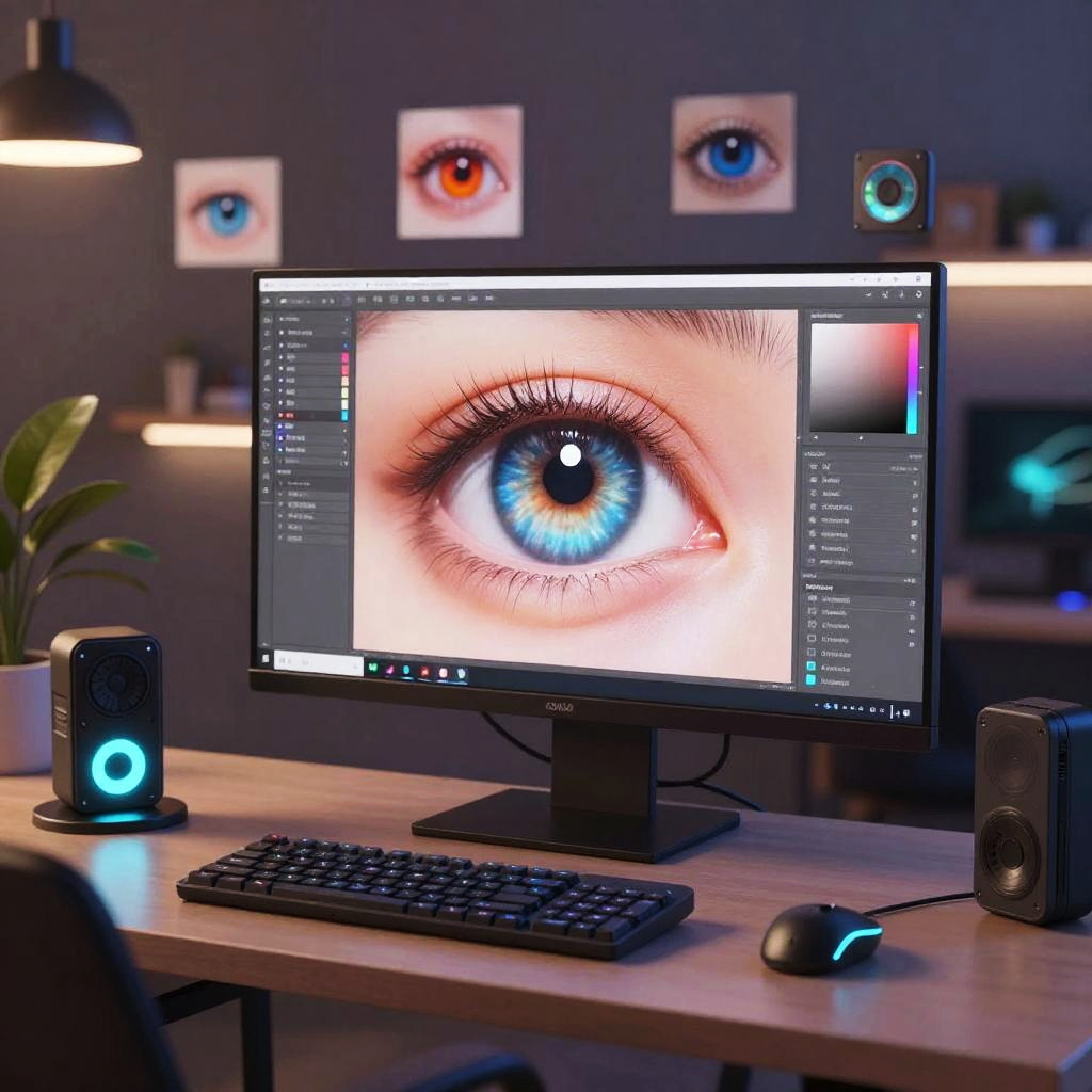 Make a movie poster online free: cozy home office with a person crafting a horror movie poster on their laptop, dark moody background contrasted with vivid red and black poster graphics, virtual design tools floating above the keyboard, inviting creative space