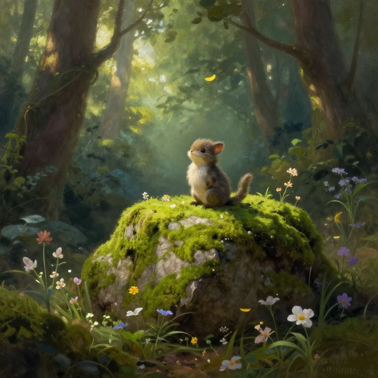 Snall depicted as a small mythical creature sitting on an ancient moss-covered stone, surrounded by delicate flowers and soft sunlight filtering through tall trees, enchanted woodland scene, painterly style with rich textures