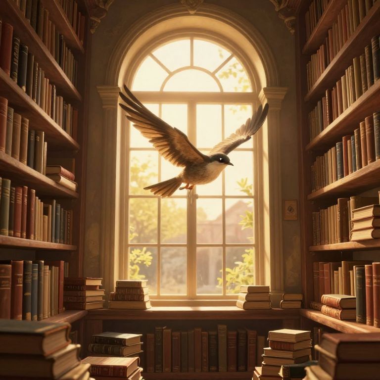 In a serene, vintage-style library bathed in golden-hour light streaming through an arched window, a bird-like creature soars gracefully among shelves of ancient books, symbolizing the idea that knowledge takes flight when misunderstood but returns when truly comprehended, rendered in a detailed digital art style with dramatic lighting effects.