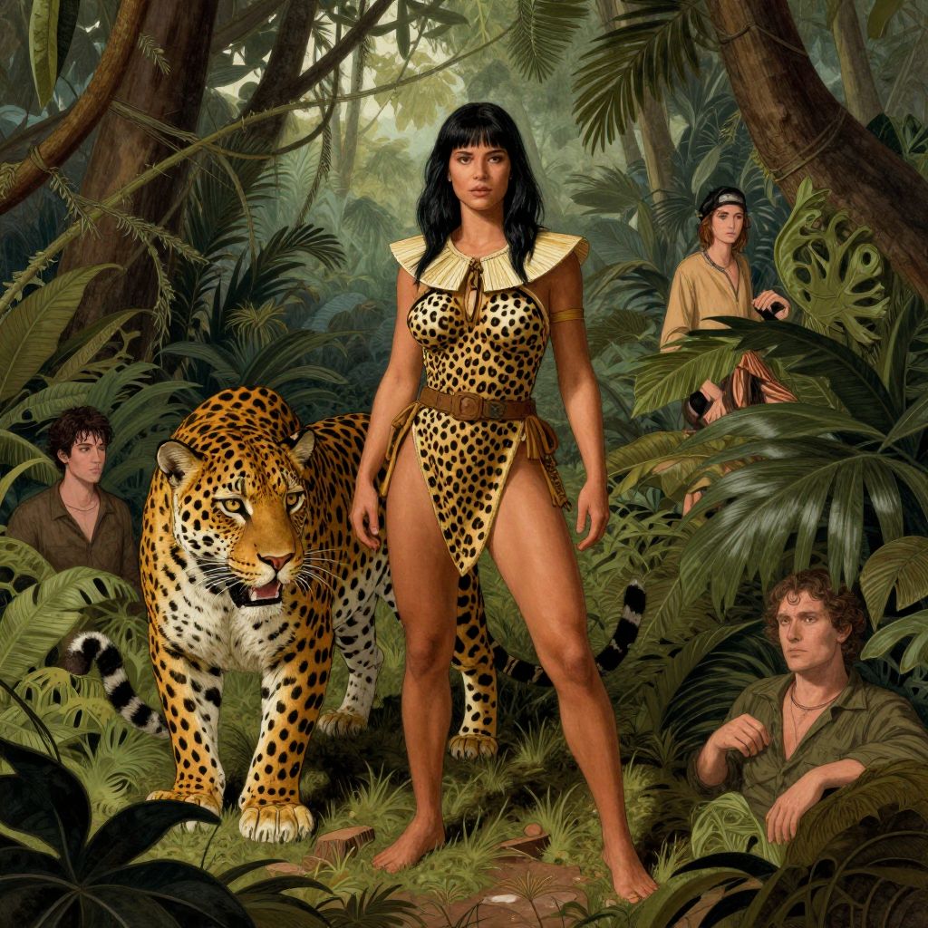 Digital painting of a fierce, black-haired woman in leopard-print loincloth and collar, standing with a jaguar in lush jungle, surrounded by four