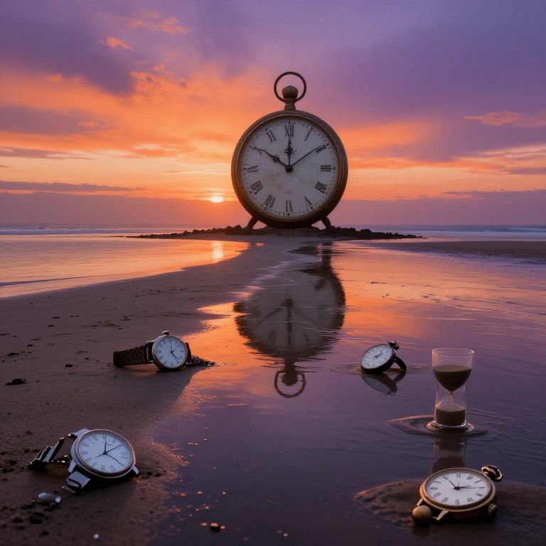 Compose an image reminiscent of surrealist masterpieces, portraying a dreamy landscape where a colossal timepiece dominates a tranquil shoreline at dusk. The sky above is painted with vibrant shades of orange and purple, creating elongated shadows along the waterline as the tide recedes, uncovering a path littered with various remnants of time - wristwatches, pocket watches, and sand-filled glasses - each stopped at unique instants in their journey. From an unusual vantage point, we observe these temporal artifacts beneath the surface, their silhouettes mirrored on the damp sands, generating a captivating interplay between the tangible and the ethereal, invoking sentiments of reminiscence and contemplation.