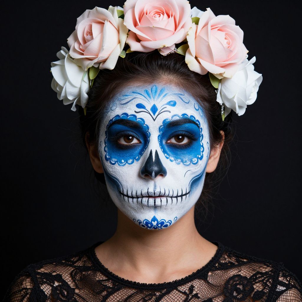 The image features a woman with a striking skull face paint, reminiscent of the Day of the Dead celebration. Her face is adorned with intricate blue and white designs, including a detailed skull pattern that covers her forehead, cheeks, and nose. The paint is meticulously applied, with vibrant blue accents and delicate white lines that create a striking contrast against her skin. Her hair is styled in an elegant updo, decorated with a lush floral crown composed of large, soft pink and white roses, adding a touch of elegance and femininity to the overall look. She is wearing a black lace top, which complements the dark background and highlights the intricate details of her face paint. The composition is balanced, with the floral crown and face paint drawing the viewer's attention to the center of the image, while the black top and background provide a stark contrast, making the colors and details of the face paint stand out even more.