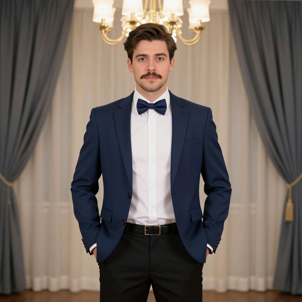 Photograph of a young Caucasian man with light skin, dark brown hair, and a neatly trimmed mustache. He is standing in a formal setting, wearing a dark navy blue suit with a white dress shirt and a black bow tie. His hands are in his pockets. The background features blue velvet curtains with gold ties, white walls, and a large, ornate chandelier with lit bulbs. The man's expression is neutral, and he looks directly at the camera. The overall style is elegant and formal, with a focus on classic men's fashion.