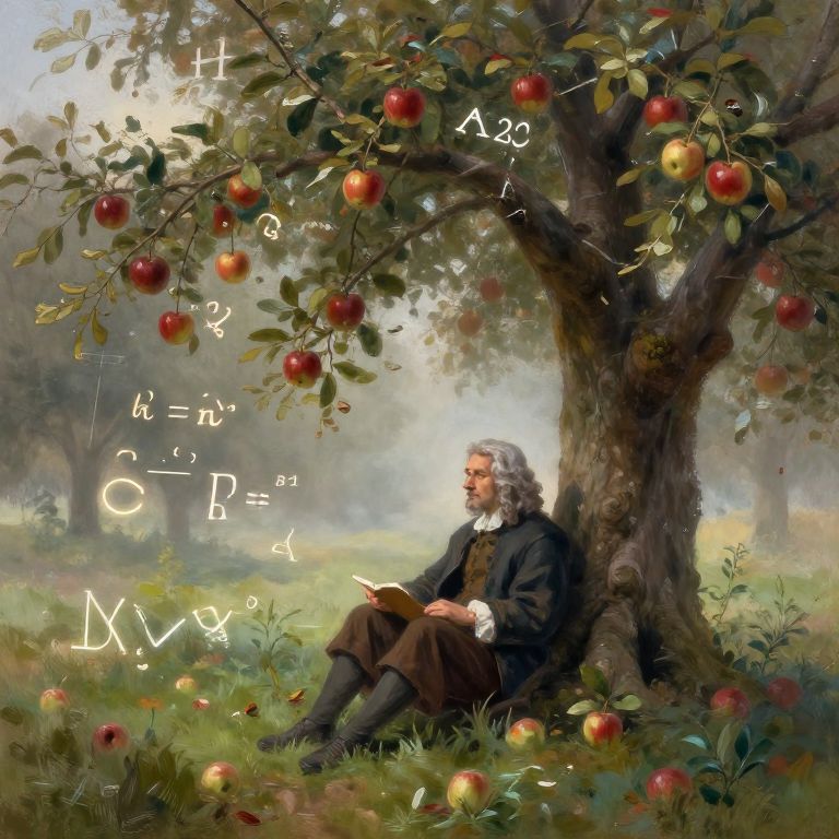 Newtons sitting under an ancient apple tree in a misty orchard at dawn, surrounded by glowing mathematical symbols and softly falling apples, rendered in a painterly, impressionistic style.