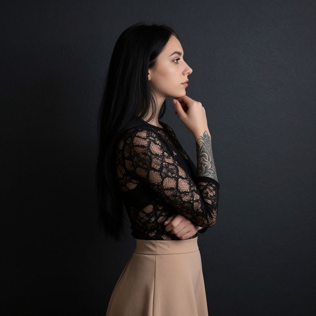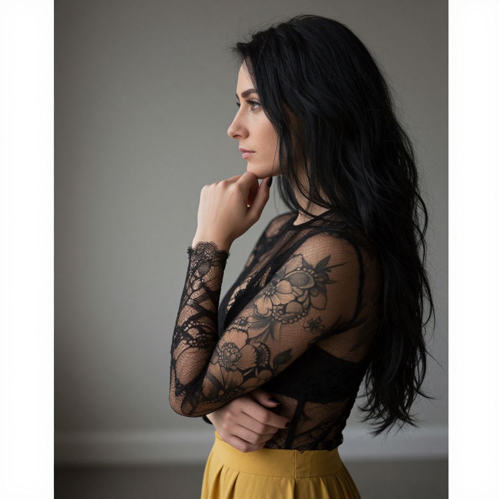 Photograph of a young woman with long, wavy black hair and fair skin, standing in profile against a gray background. She is wearing a sheer black lace top with intricate floral patterns, revealing a black bra underneath, and high-waisted yellow pants. Her right hand is gently touching her chin, and her left arm is crossed over her stomach. The lighting is soft, highlighting her delicate features and the texture of the lace. The overall style is elegant and modern, with a focus on natural beauty and subtle sophistication.