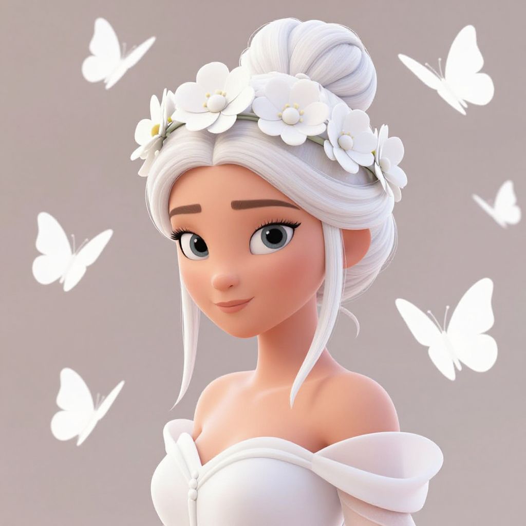 The image depicts a woman adorned with a crown of white flowers, her hair styled in an intricate updo. She is surrounded by a multitude of white butterflies, some of which are in flight, creating a sense of movement and ethereal beauty. The background is a soft, neutral tone, allowing the white elements to stand out prominently. The overall composition is balanced, with the woman centrally positioned and the butterflies dispersed around her, adding depth and dimension to the scene. The style is reminiscent of Pixar animation, with a focus on soft, pastel colors and delicate textures, evoking a sense of fantasy and wonder.