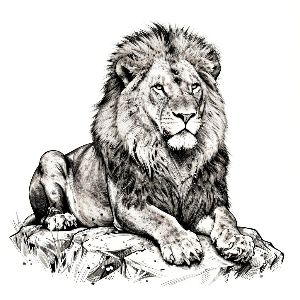 Sketch artwork depicting a majestic lion resting on a rocky outcrop, fine cross-hatching highlighting its muscular form and flowing mane, set against a minimalist background that emphasizes strength and calm.