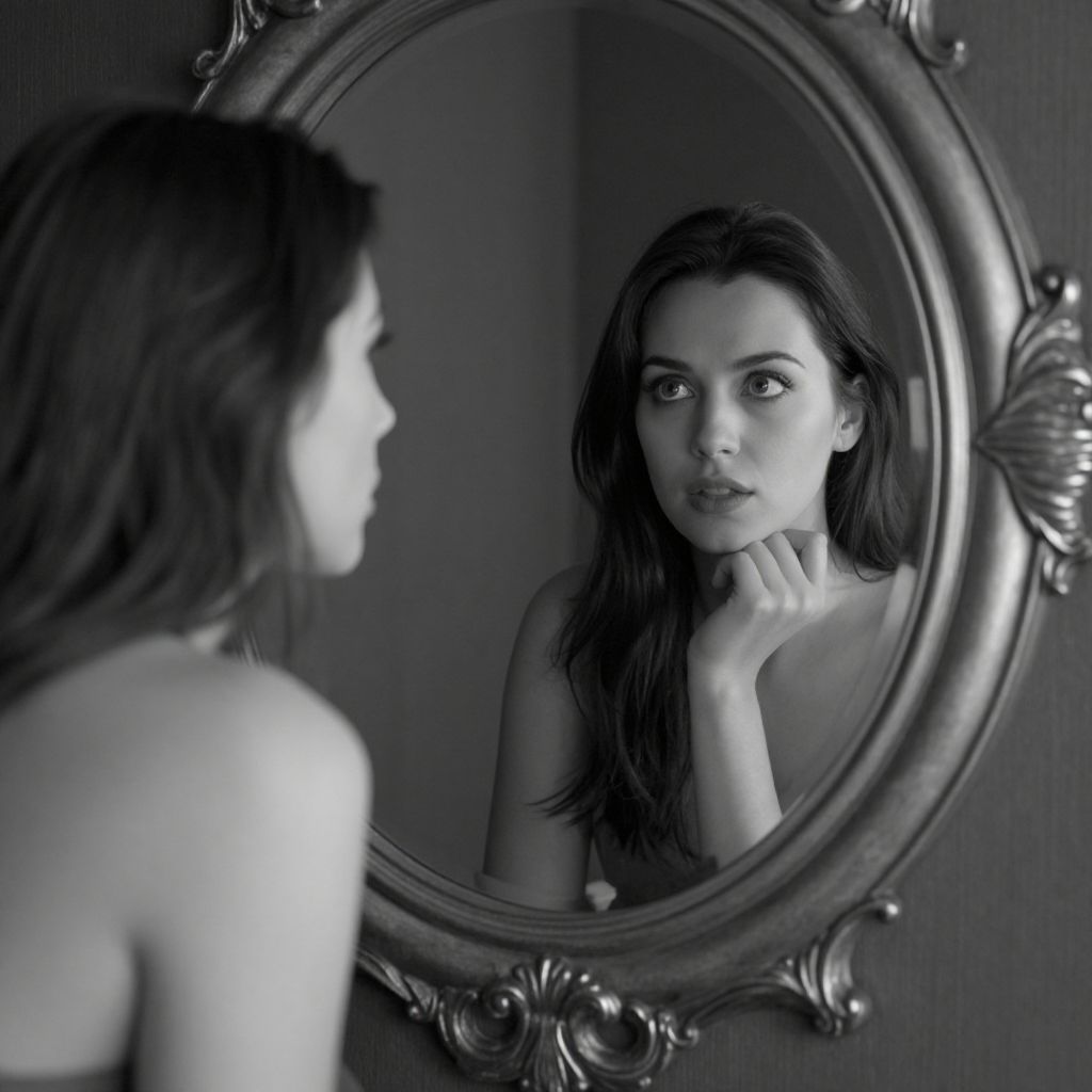 Photograph in monochrome showing a young woman with long dark hair, gazing at her reflection in an ornate, oval mirror with floral accents. She is topless, with her right hand resting beneath her chin, and her expression is contemplative. The mirror is centered in the image, reflecting her face and upper body. The background is blurred, focusing attention on her and the mirror. The lighting is soft, highlighting her facial features and the texture of her hair, creating a moody, introspective atmosphere.