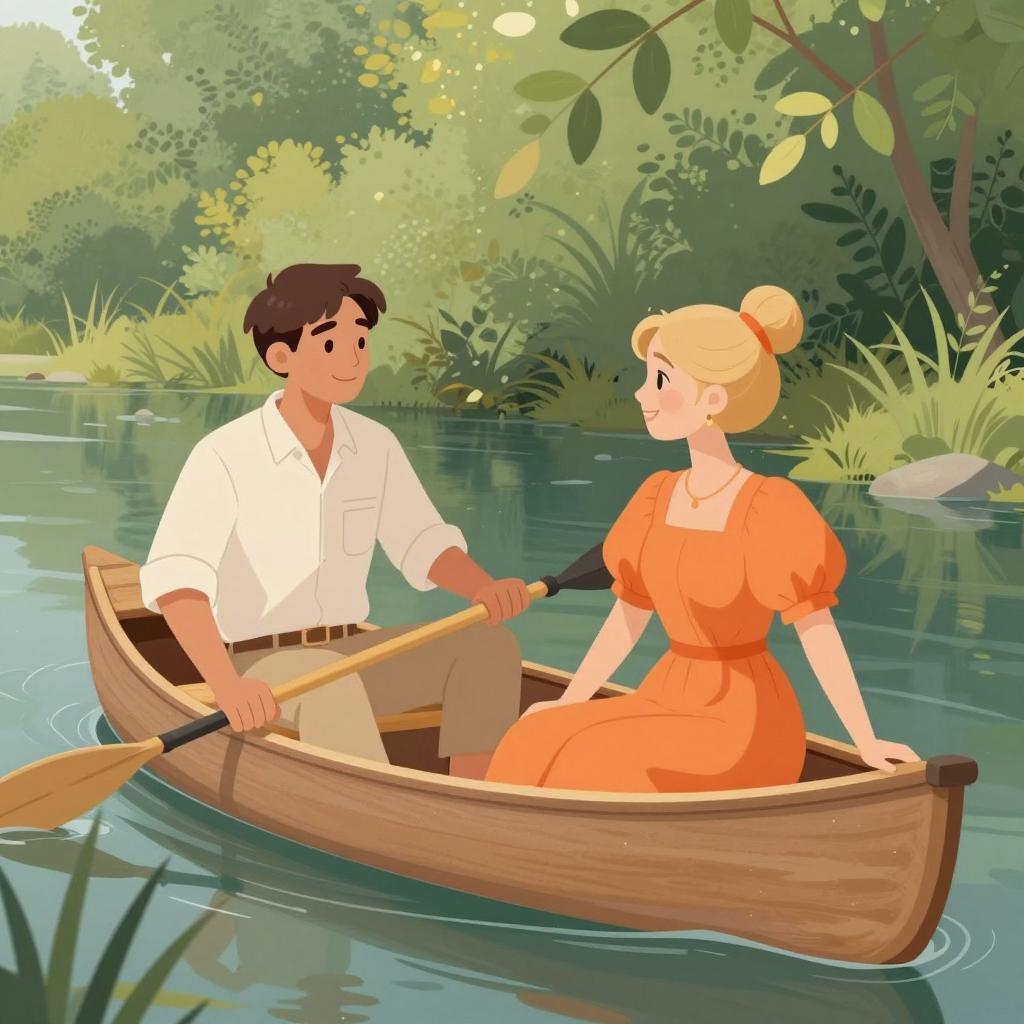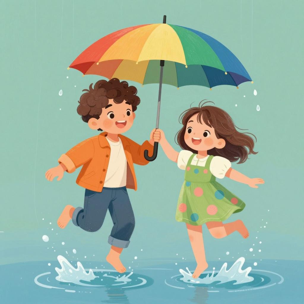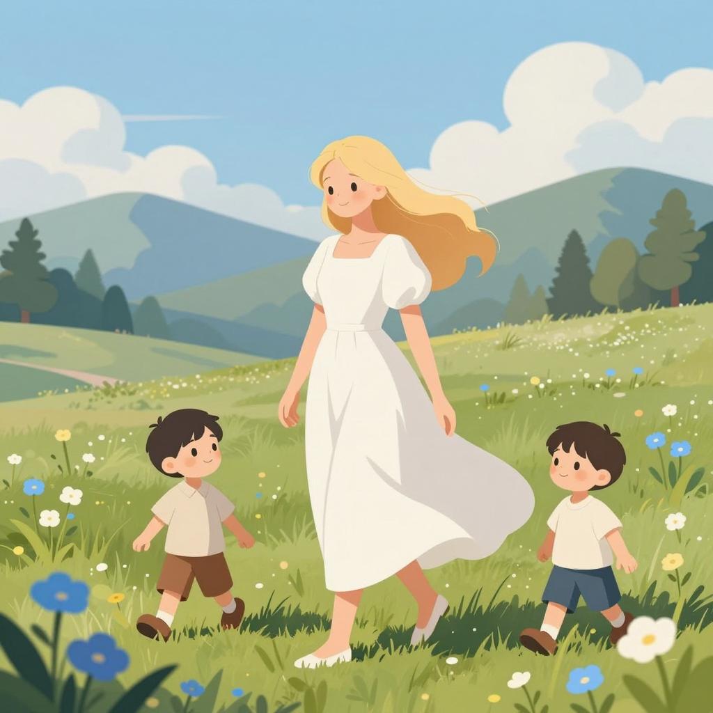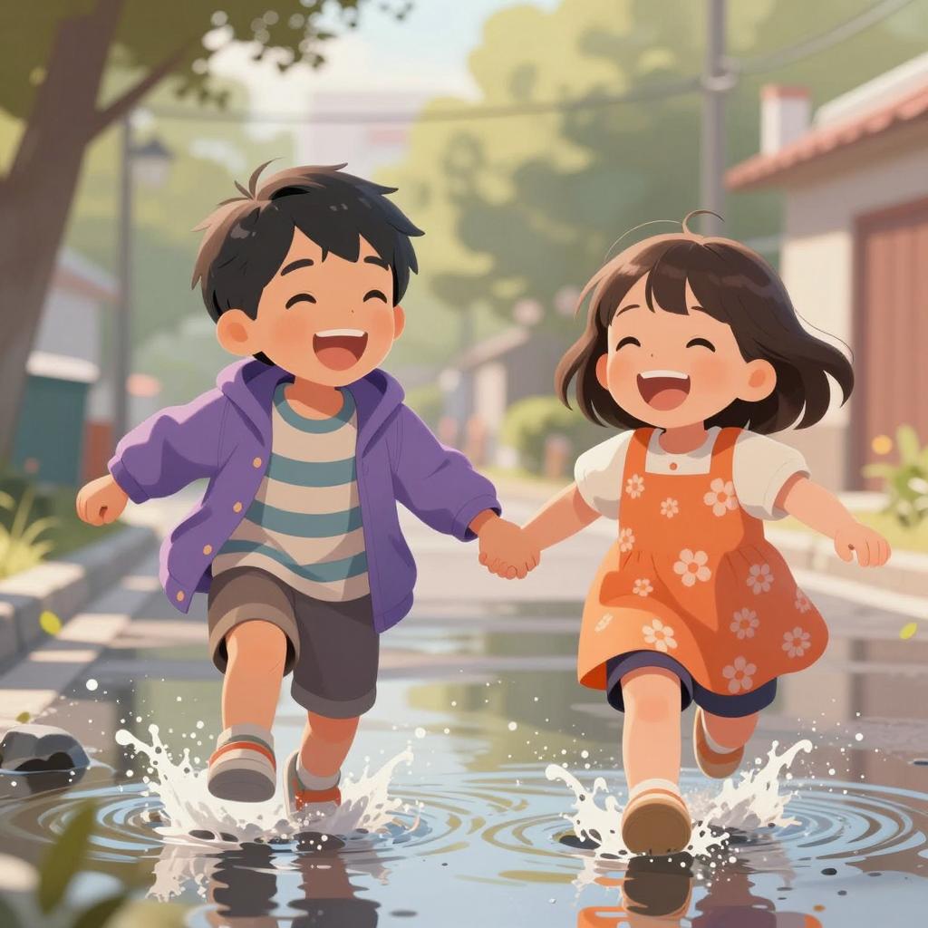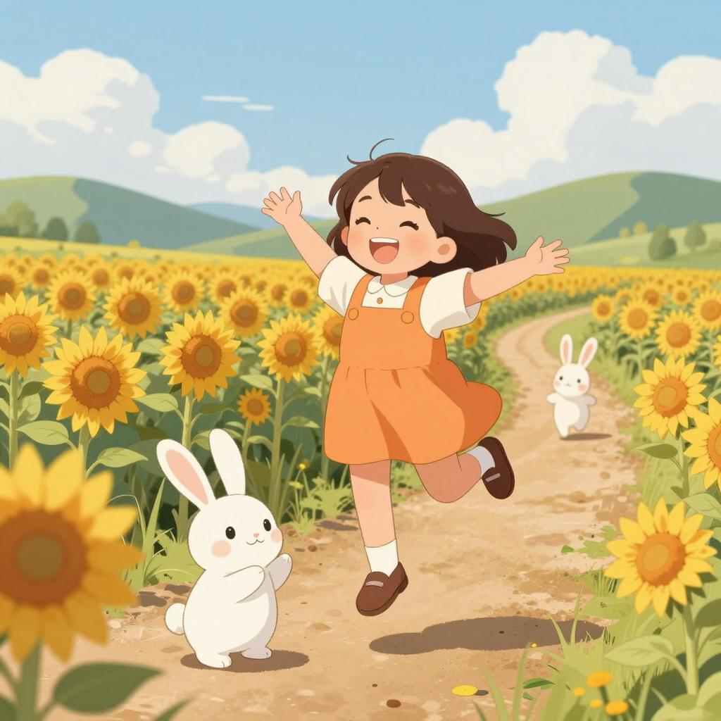 Illustration of two children running through a field of flowers. Boy with dark brown hair, white shirt, brown suspenders, black pants, barefoot. Girl with light brown hair, white shirt, orange skirt. Both smiling, arms swinging. Bright sunlight, orange and white flowers, grass, distant trees. Painterly style, vibrant colors, dynamic motion.