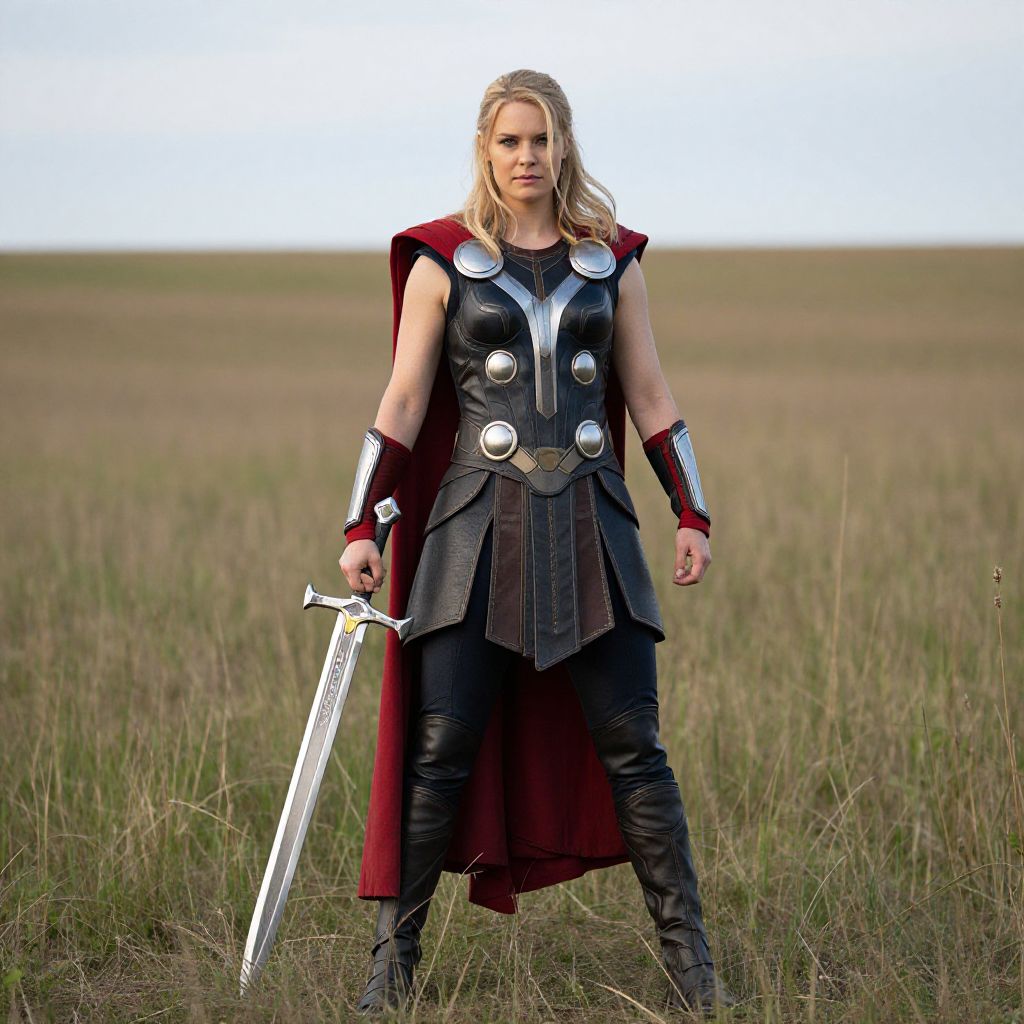 "Valkyrie Costume Thor Ragnarok, a woman dressed as thor and holding a sword in a field"