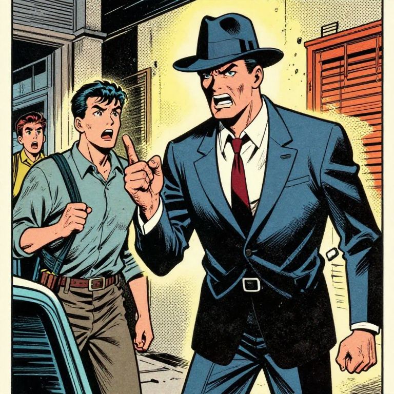 Comic-style drawing of a fierce, mustachioed man in a blue suit and fedora pointing aggressively at a shocked man in a gray shirt and