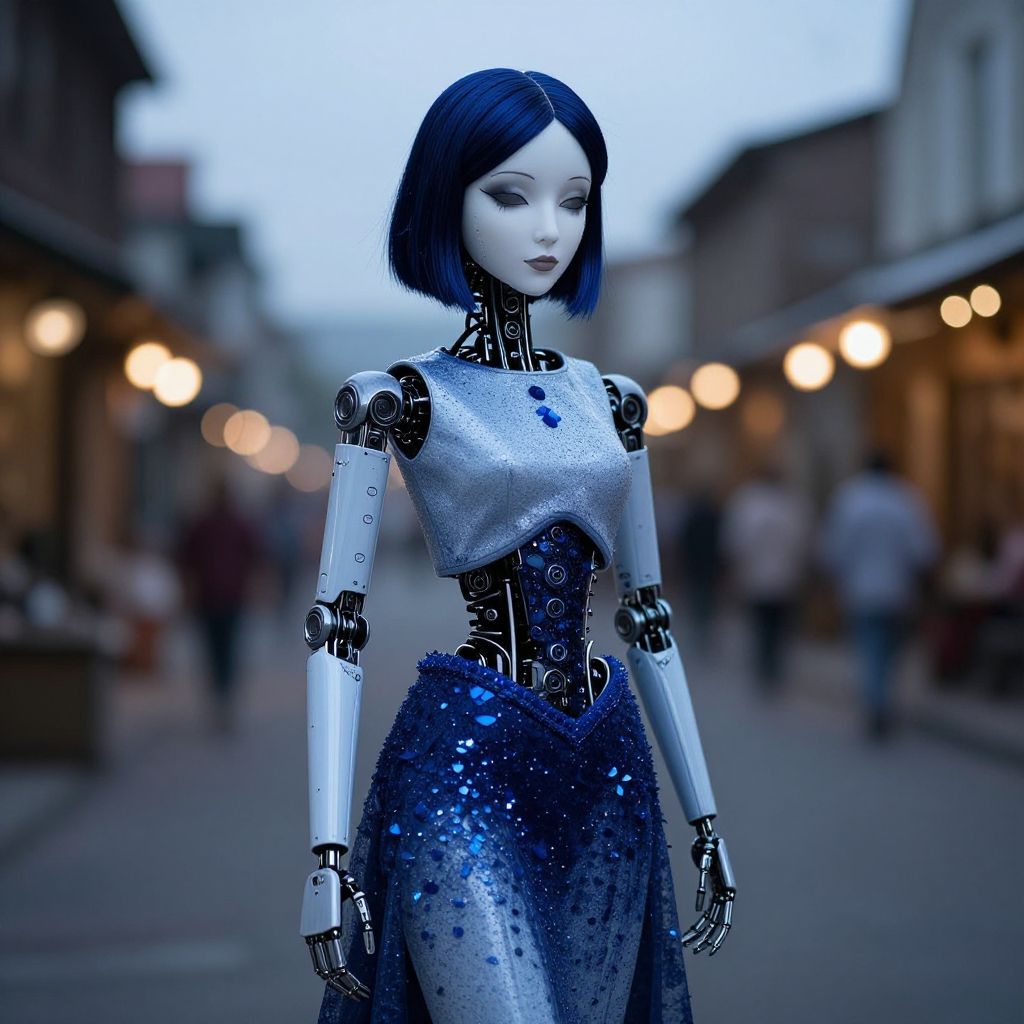 Photograph-style CGI of a futuristic female android with a pale, porcelain-like face and short, sleek blue hair. She has silver metallic shoulders and a black, intricately jointed torso. Her dress is a shimmering blue with sequins, fitting closely to her robotic frame. She stands in a blurred, outdoor evening street scene with warm, out-of-focus streetlights and indistinct pedestrians in the background. The overall color palette includes cool blues and metallic silvers, contrasting with the warm, bokeh lights. Her expression is neutral, with slightly parted lips and almond-shaped eyes.