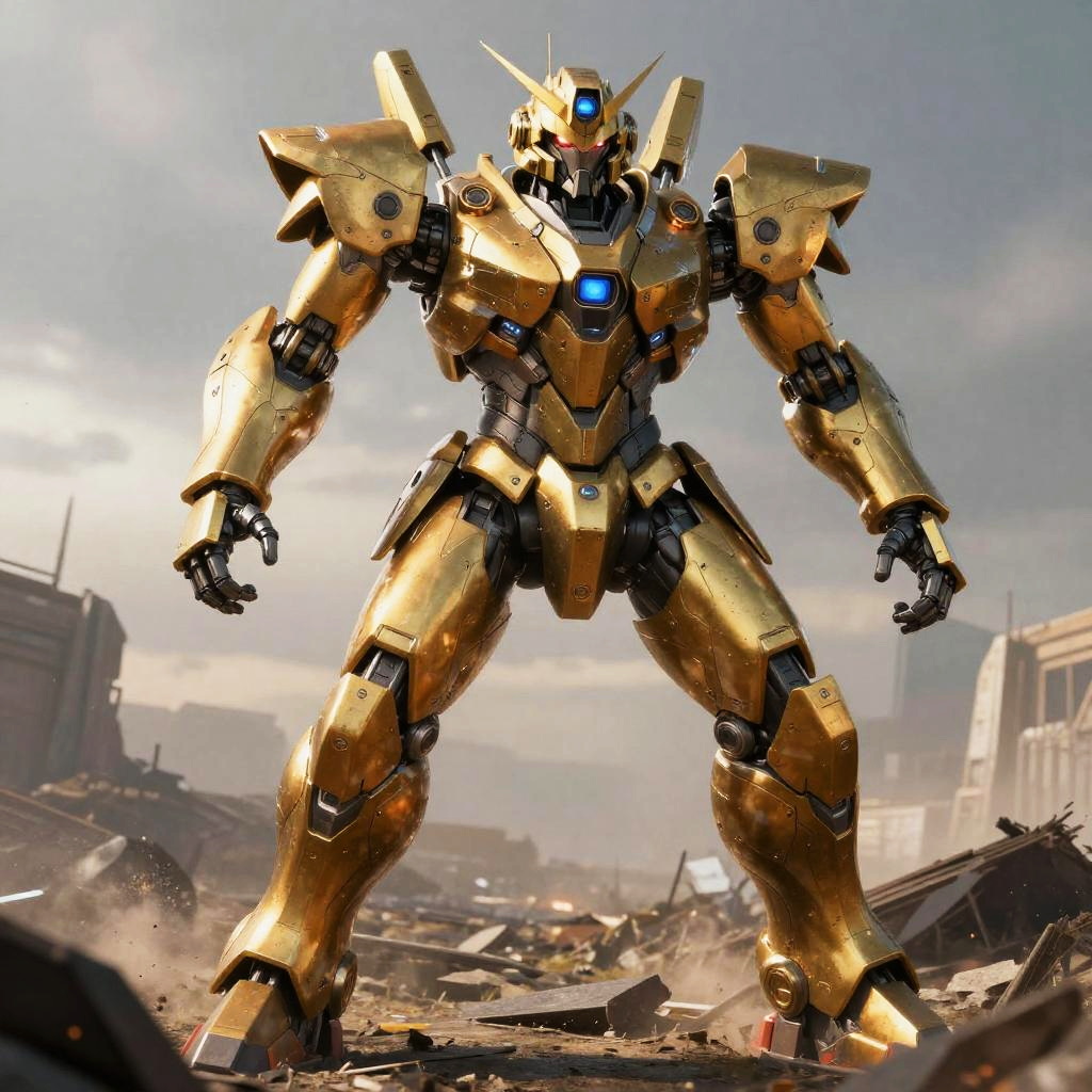 Gold shoulder pads on a futuristic mech suit, heavy armor plates with sleek designs, set against a dystopian war-torn landscape, dynamic action pose, cinematic lighting