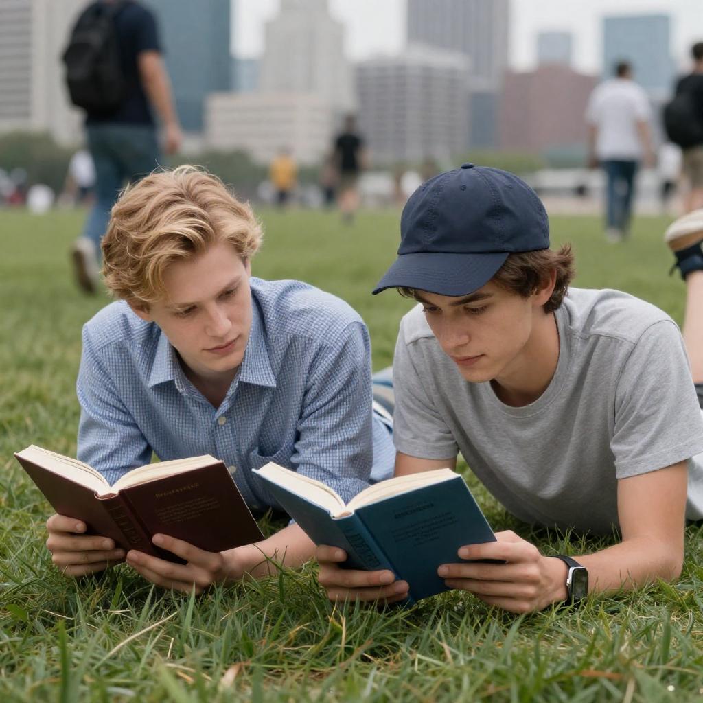 Young man with short brown hair, fair skin, wearing a light gray shirt, reading a book in a vintage car. Blue denim-covered shoulder in foreground, sunlight through car window, blurry field outside. Smiling, relaxed pose.