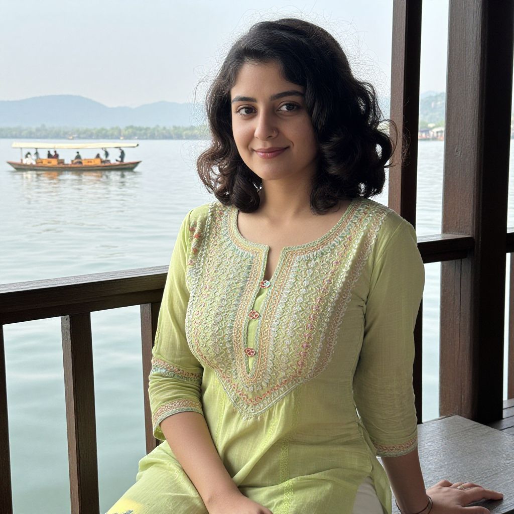 A vibrant, natural-light portrait of a young woman with dark curls and a gentle smile in a traditional Kashmiri suit made of embroidered cotton, seated on a wooden balcony overlooking the Dal Lake with boats gently moving on the water.. The woman has big tits and cute face