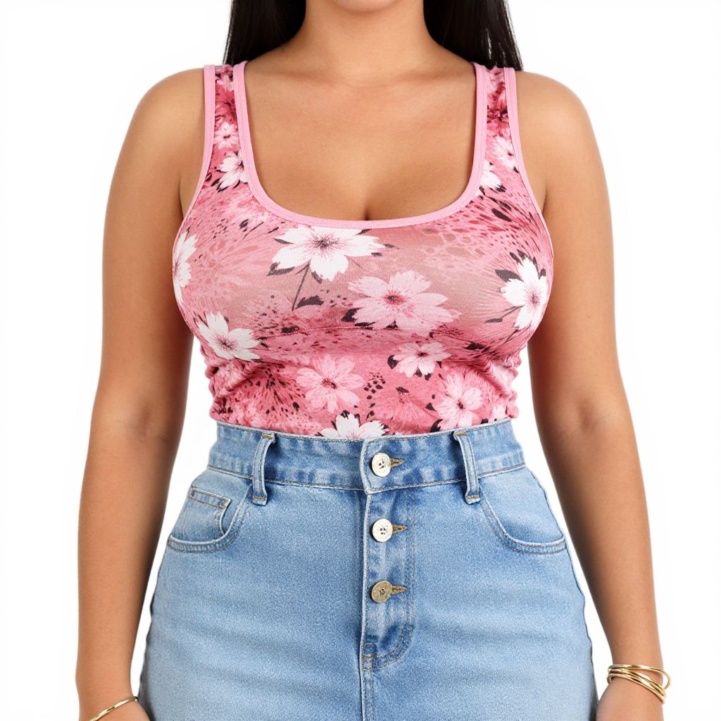Photograph of a woman from the neck to the waist, showcasing a pink, floral-patterned, scoop-neck tank top that accentuates her medium-sized breasts. She pairs the top with high-waisted, light blue denim jeans featuring a button closure and two pockets. Her long, straight black hair is partially visible. She wears a gold bracelet on her right wrist. The background is plain white, making the colors of her outfit stand out. The image is brightly lit, highlighting the textures and patterns of her clothing.
